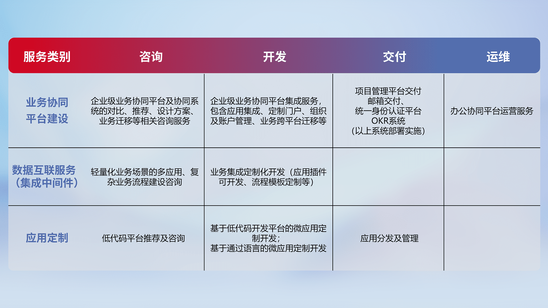 针对钉钉、、企微、、、IDaas等平台级产品提供产品的规划、、方案、、、、交付、、、定制化开发等服务,,实现如统一协同办公、、智能客户服务、、混合会议管理、、、智能数据查询、、、、等业务场景,,,实现数字化转型。。